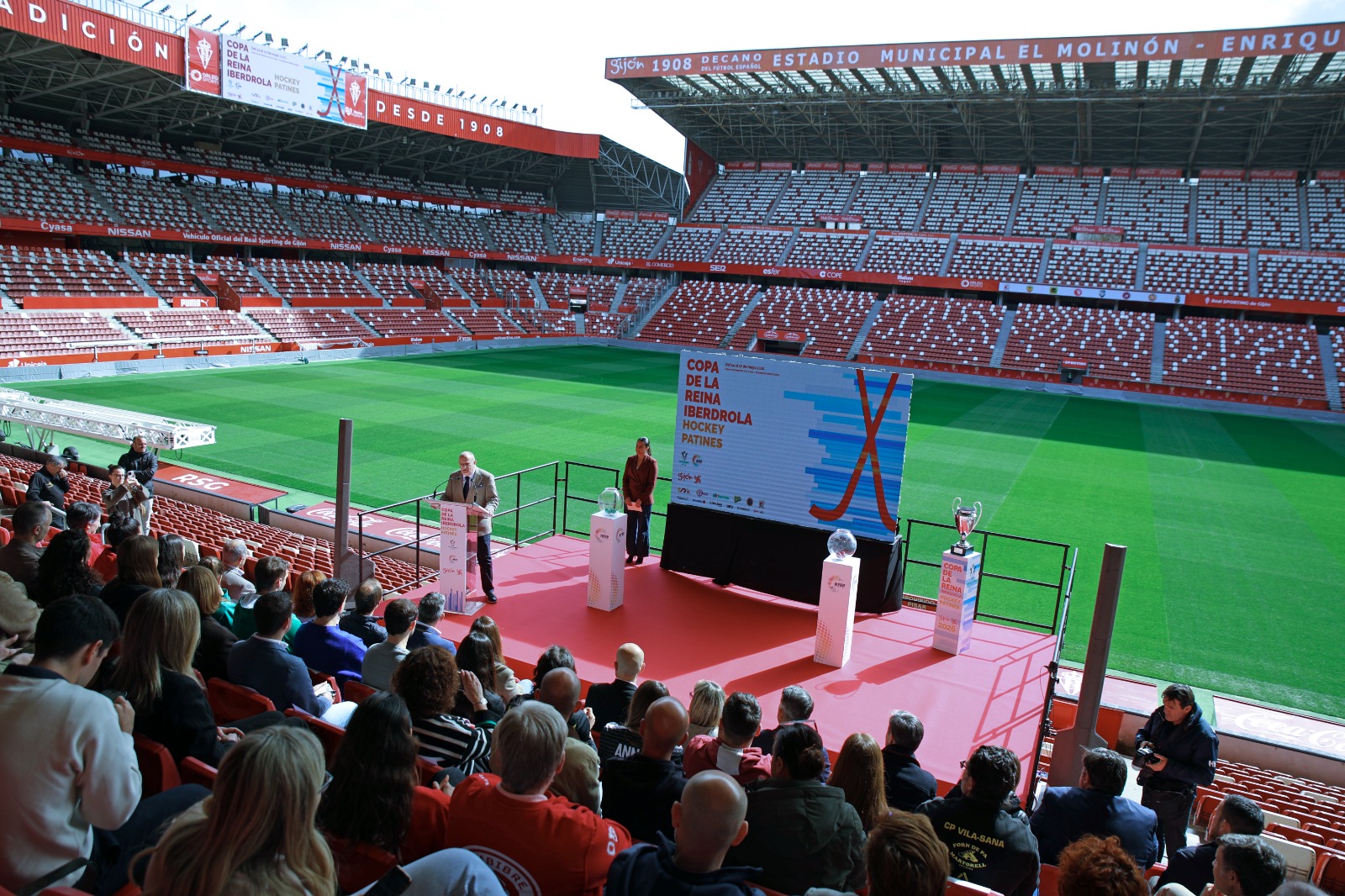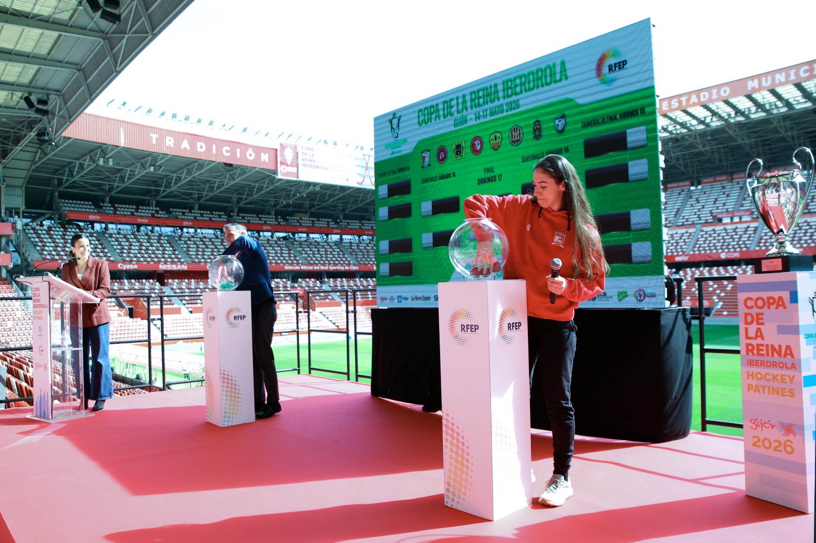 El Estadio Municipal de El Molinón-Enrique Castro «Quini», fue el escenario elegido por el Ayuntamiento de Gijón para que la Real Federación Española de Patinaje llevase a cabo el sorteo de la Copa de la Reina, que se disputará entre los días 14, 15, 16 y 17 de mayo. A las 11:00 horas, comenzó el acto al que asistieron las autoridades locales junto al presidente de la Real Federación Española, Carmelo Paniagua, acompañados de jugadoras y entrenadores de los ocho conjuntos que disputarán el prestigioso trofeo. Por las Águilas, la capitana Gisela Vicente junto a su entrenador, Don Carlos Figueroa que tuvo la oportunidad de una breve alocución y Jesús Blanco, presidente del Bembibre H.C también formó parte de la expedición berciana. Después de ser cabeza de serie y acceder a la Copa de la Reina por vez primera y siendo el primer equipo femenino del Bierzo en llegar hasta una torneo como éste, el sorteo deparó los siguientes cruces, jugando el viernes 15 de mayo su primer partido en el Palacio de Deportes de La Guía-Adolfo Suárez.